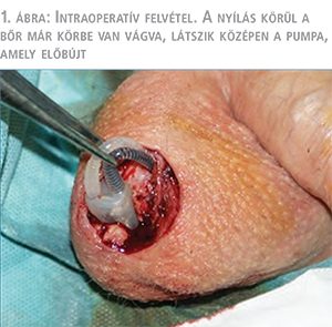 J. F. 76 éves igen jó állapotú beteget 2010-ben biopsziával igazolt adenocarcinoma miatt radikális prostatectomiával gyógyítottuk. A szövettani preparátum 5 mm-nél kisebb sebészi szél pozitivitást igazolt, ezért a területet besugaraztattuk. A PSA-érték a rendszeres ellenőrzés során nem emelkedett 0,03 ng/ml fölé és hormont sohasem kapott. A műtét után teljes inkontinencia jelentkezett, ez konzervatív kezelésre nem javult. A vizelési napló szerint ürítés csak éjjel történt fekvő állapotban, igaz ekkor vastag sugárban. A betét súlymérés szerint a vesztés 800 gr feletti, az urodinámiás vizsgálat a sphincter működési zavarán kívül más elváltozást nem mutatott. 2013 februárjában a szabályok szerint műsphincter-beültetés történt intraoperatív kipróbálással. A készülék a gyógyulás után jól működött, a beteg kontinensé vált. 2013 decemberében scrotumon gyulladás jelentkezett, majd itt egy hét múlva – antibiotikum adása ellenére – a bőr kilyukadt, így a pumpa a szabadba került (1. ábra).