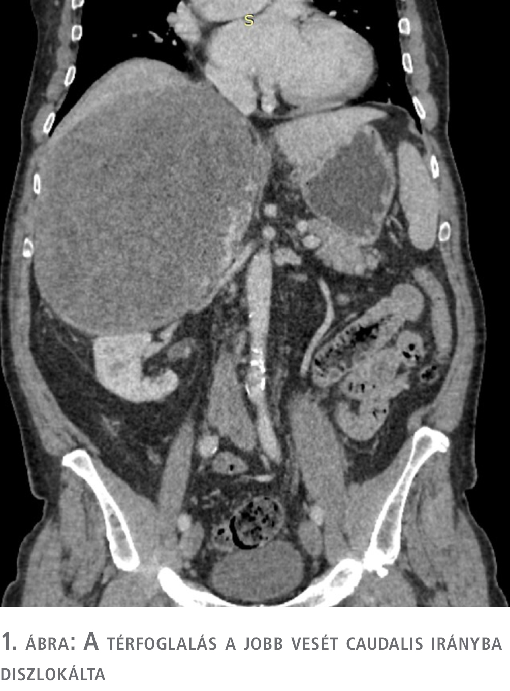 A 68 éves férfi betegünk anamnézisében hipertónia, 2-es típusú cukorbetegség, benignus prosztatahyperplasia, évtizedekkel ezelőtti varix- és kézműtét, valamint néhány évvel korábban történt esés után a bal humerus törése miatti lemezes fixálás szerepelt. Betegünk 2022 elején jobb oldali, alhasba sugárzó derékfájdalommal jelentkezett reumatológiai szakrendelésen, ahol röntgenvizsgálat alapján spondylosist és lumbosacralis discopathiát diagnosztizáltak, és hasi ultrahangvizsgálatra utalták.