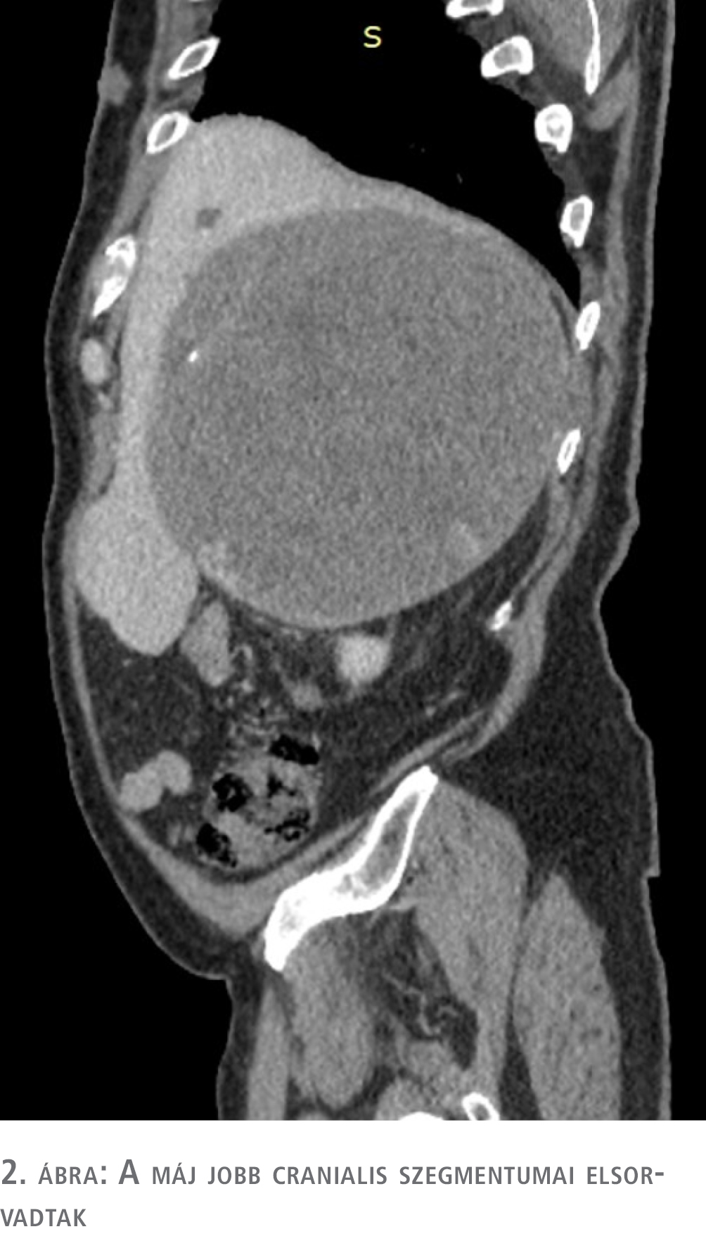 A CT eredménye alapján a szakrendelőből a beteget sürgősséggel az endokrinológiai osztályra utalták további kivizsgálás céljából. Az endokrinológiai osztályos kivizsgálás során ismét CT-vizsgálatot végeztek, amely a térfoglalás májeredetét elvetette, és halmozási dinamikája alapján elsősorban adrenocorticalis carcinomának véleményezte (1–4. ábra). A hormonprofil alapján hormontermelésre utaló eltérés nem igazolódott. ACTH-, DHEA-S-, kortizol-, CgA- és vizeletmetanefrin-szintek meghatározása, valamint negatív eredményű dexametazonszuppressziós teszt történt. A vizsgálatok és a klinikai kép alapján hormontermelő tumor nem igazolódott. Biopsziát nem végeztek, tekintve, hogy terápiás konzekvenciája nem lett volna sem malignus, sem malignitás nélküli eredmény esetén: a terime mérete alapján malignitási potenciálja nagy, ily módon műtéti ellátása csak malignusnak tekintve történhet.