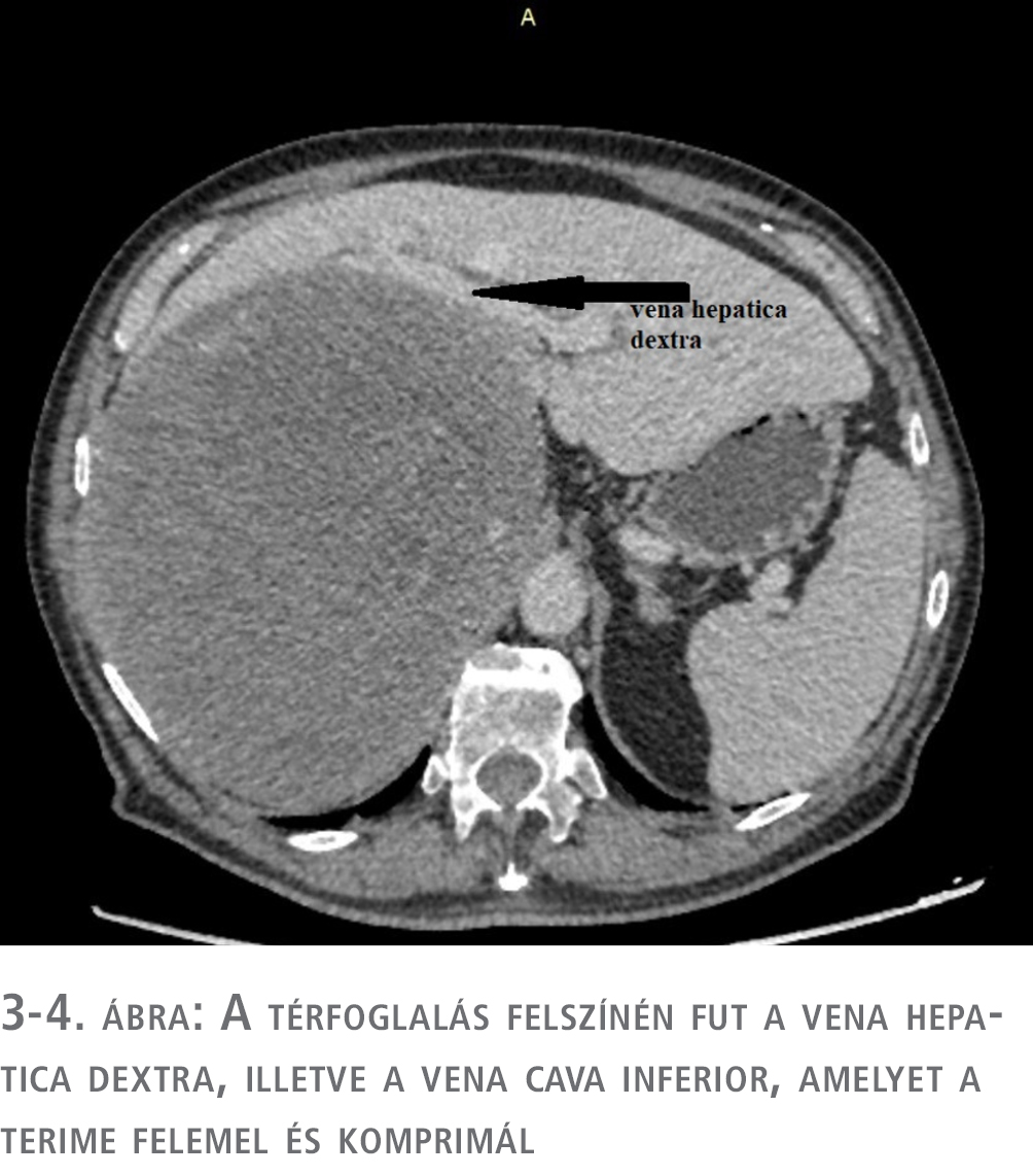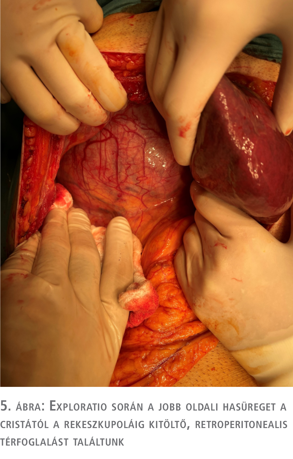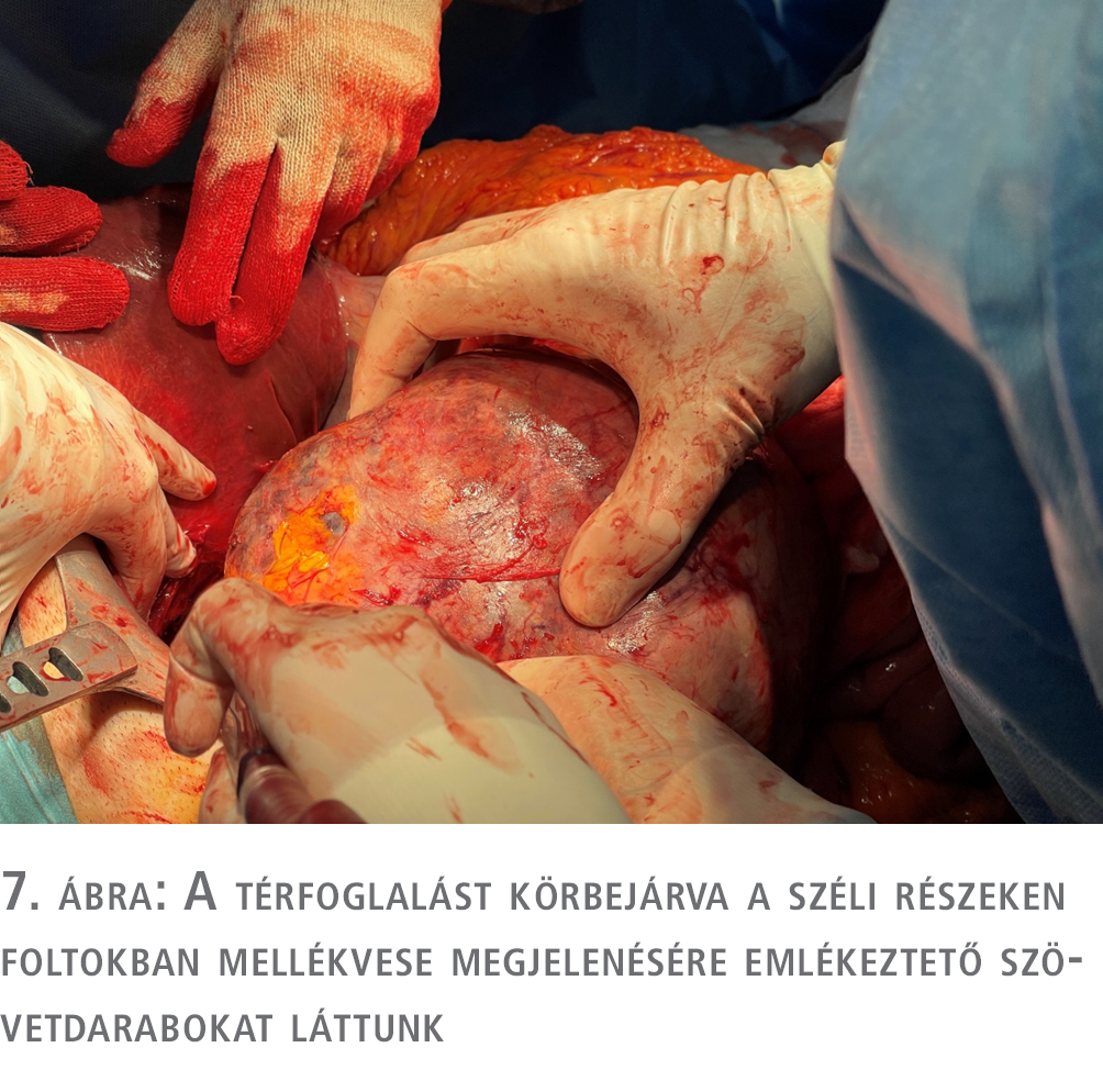 Az elvégzett vizsgálatok alapján egy nem hormontermelő, valószínűleg mellékvese-eredetű, mérete és radiológiai jellemzői alapján malignitást is felvető, környező szerveket diszlokáló és komprimáló terime műtéti eltávolítása abszolút indokolt. A műtét során jobb túlsúlyú bilaterális subcostalis metszésből jutottunk be a hasüregbe, ez a metszésvezetés szükség esetén hosszabbítható, illetve a CT-felvételen látott diszlokált, atípusos helyzetű lig. hepatoduodenale, az aorta és a vena cava inferior ebből a metszésből a legbiztonságosabban megközelíthető, és szükség esetén lefogható. Exploratio során a jobb oldali hasüreget a cristától a rekeszkupoláig kitöltő, retroperitonealis térfoglalást találtunk (5. ábra).