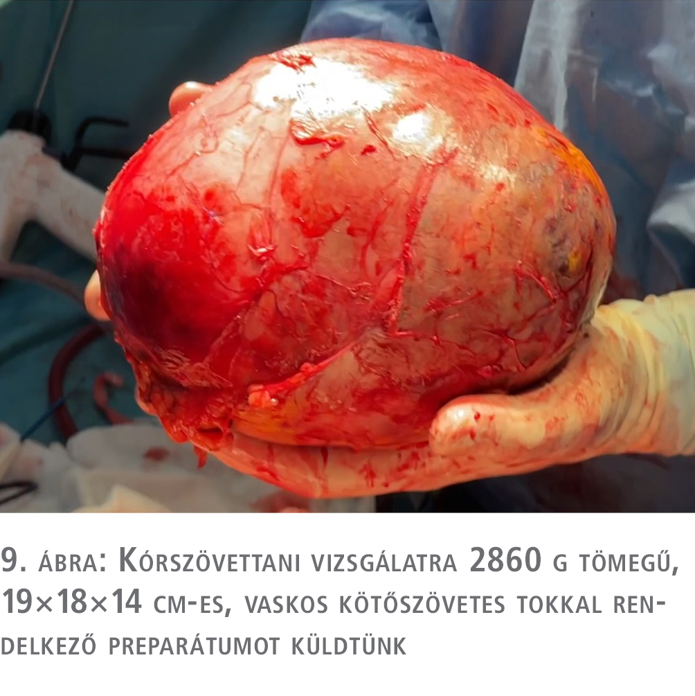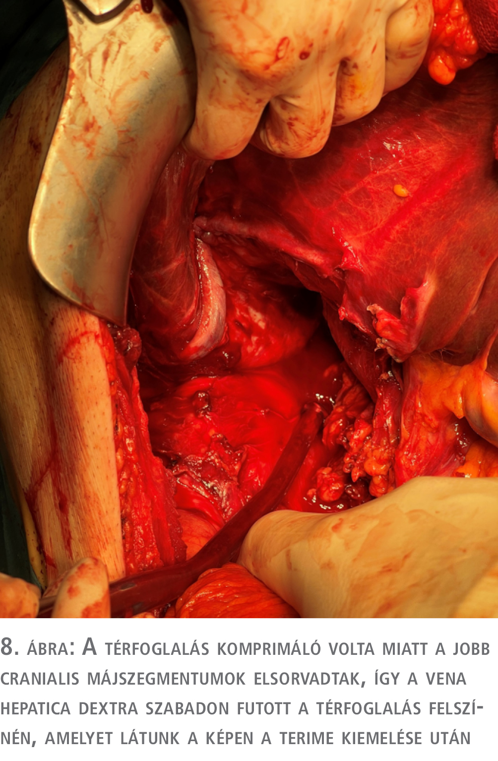 A térfoglalást környező szervekről (máj, vese, nagyerek) lepreparáltuk (8. ábra), a térfoglalásba futó ereket klipekkel, illetve elektrodisszekciós eszközzel láttuk el, a terime a rekesztől dorsalisan nem volt differenciálható, itt élesen választottuk le, majd rekonstruáltuk a rekeszizmot. A műtét során az elváltozás tokja nem sérült. A cell-saver (Fresenius CATSmart, tumorfilterrel) alkalmazásával nyert 225 ml vért a betegnek visszaadtuk. Műtéti vérvesztés összesen 1200 ml volt, az autotranszfúzió mellett 2 egység vörösvértest-koncentrátumot is kapott intraoperatívan a beteg.