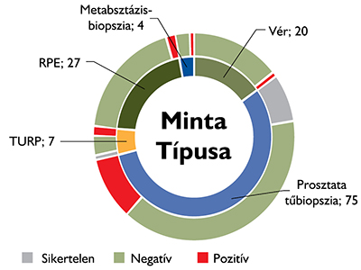A szövetminták a mintavétel típusát tekintve a következők voltak: 75 (56%) tűbiopszia prosztatából, 20 (15%) vérminta, 27 (20%) radikális prostatectomia (RPE), 7 (5%) transurethralis reszekátum (TURP), 4 (3%) metasztázisbiopszia. A prosztatából vett tűbiopsziás minták gyakrabban adtak sikertelen eredményt (n=10; 13%) (p=0,016) az összes többi mintatípushoz viszonyítva. A 7 TURP mintából 1 vizsgálat lett sikertelen, míg az RPE-, a vér- és a metasztázisbioptátum-mintákból minden vizsgálat sikeresen elvégezhető volt (2. ábra).