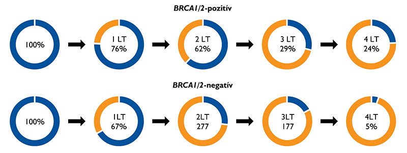 3. ábra: Gyógyszeres terápiák a BRCA1/2-mutációk függvényében. Az ábra a különböző vonalakban kezelet betegek arányát mutatja az BRCA1/2-pozitív (felül) és negatív (alul) betegekben