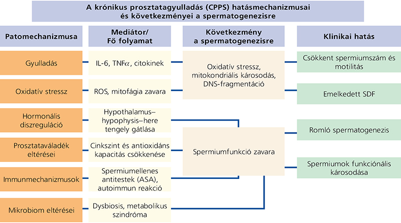 A legújabb kutatások és az irodalmi összefoglalók alapján a CPPS patomechanizmusában több tényező játszik szerepet: a gyulladásos mediátorok fokozott jelenléte, a neuroendokrin diszfunkció, a metabolikus szindróma és a bélmikrobiom egyensúlyának felborulása egyaránt hozzájárul a tünetegyüttes kialakulásához. A prosztata lokális gyulladása következtében felszabaduló proinflammatorikus citokinek (pl. IL-6, TNFa) oxidatív stresszhelyzetet váltanak ki, amely előbb a spermiumok membránját rombolja, majd beljebb hatolva mitokondriális károsodást okoz, és ronthatja a spermiumok DNS-integritását. A mitofágia (az elpusztult mitokondriumok “eltakarítása”) elmarad, ami további károsodásokhoz vezet. A folyamat eredményeként az ondóváladék minősége jelentősen romolhat: általában csökken az ejakulátum volumene, a teljes spermiumszám és a spermiumkoncentráció; továbbá romlik a hímivarsejtek progresszív motilitása és normál morfológiája is. Ezzel párhuzamosan gyakoribb a spermiumok funkciójának károsodása, tehát növekszik a DNS-fragmentációs index (SDF), amely az utóbbi időben az egyetlen evidenciaszinttel bíró funkcionális paraméter: a fertilitási potenciál jelenleg egyik legfontosabb prediktora.
