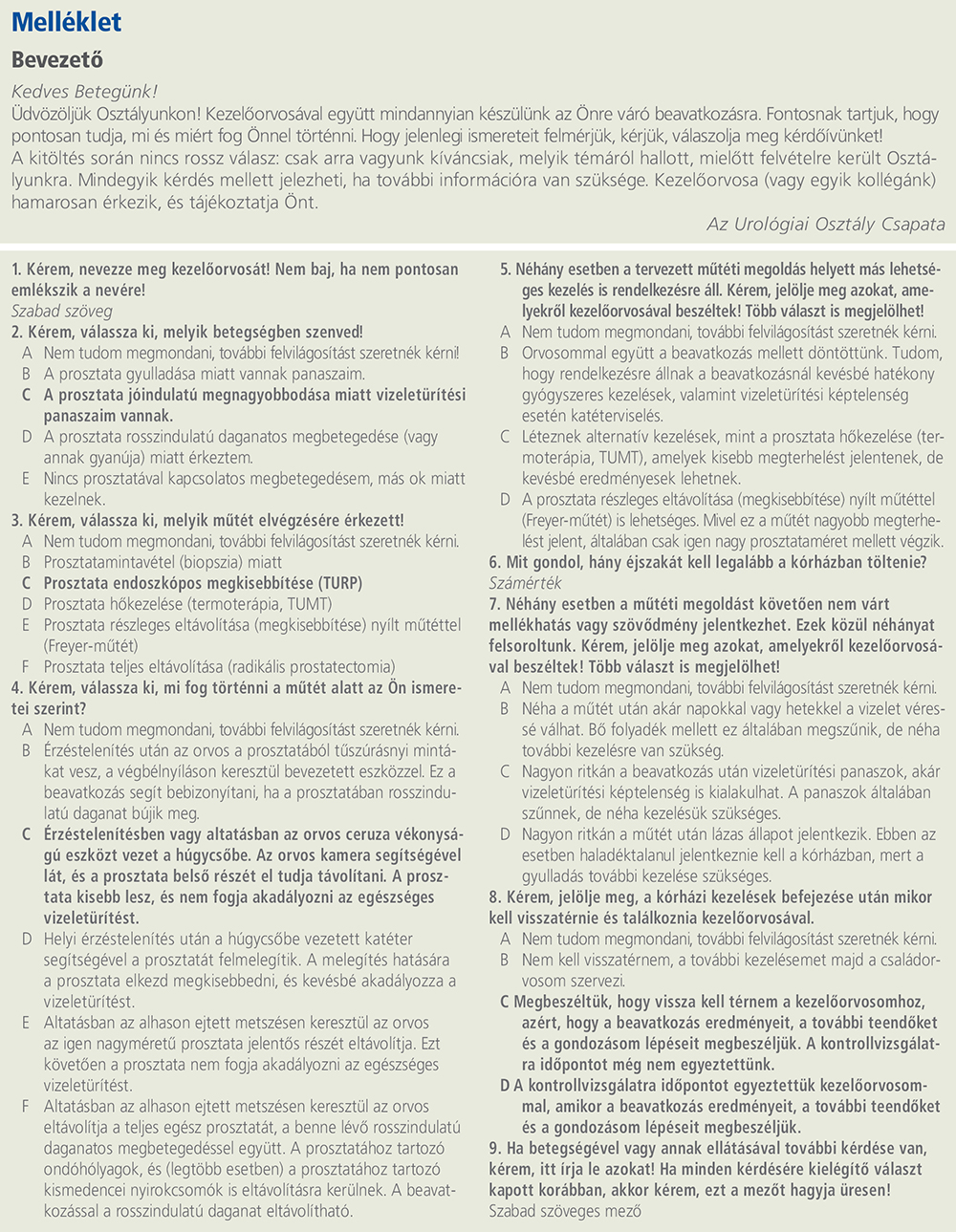 Az elsőként vizsgált beavatkozási csoport a prosztataműtétek köre volt. Ennek több oka van: egyrészt az urológiai osztályokon ezek a leggyakrabban végzett műtétek; másrészt a jóindulatú prosztatamegnagyobbodás kezelése elsősorban az életminőséget javítja, ezért a szövődmények és az alternatív kezelések ismerete kiemelten fontos. A rosszindulatú prosztatadaganat esetében pedig az irányelvek már a tumormarker-vizsgálat előtt előírják a teljes körű tájékoztatást. A betegség kezelésének gyors fejlődése miatt a teljeskörű tájékoztatás nehezen megvalósítható, az egyénre szabott kommunikáció során pedig információk veszhetnek el. Végül, mivel a beteg több alternatív terápia közül választhat, a tájékoztatás és a közös döntéshozatal („shared decision-making”) a kezelési terv része. (Példaként a „prosztata endoszkópos megkisebbítése” [TURP] műtétre vonatkozó kérdőívet az 1. melléklet mutatja be.)