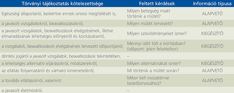 A kérdőív az Eütv. 13. §-ában meghatározott tájékoztatási kötelezettség elemeire kérdez rá. Az 1. táblázat a törvény által előírt tájékoztatási elemek és a hozzájuk illeszkedő kérdések kapcsolatát mutatja, valamint megjelöli, mely kérdések minősülnek „ALAPVETŐ”, illetve „KIEGÉSZÍTŐ” információknak.